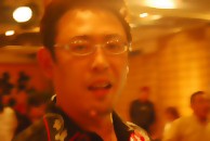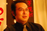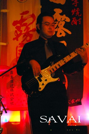 後ろの酒の垂れ幕が妙に似合う、ベース・ヤマ